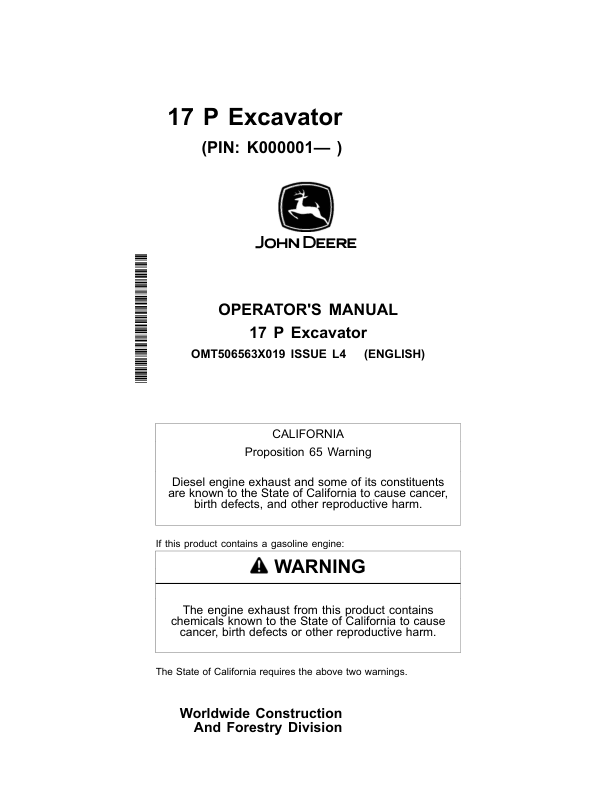 John Deere 17 P Excavators Operator’s Manuals (OMT506563X019)