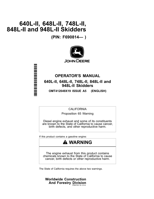 John Deere 640L-II, 648L-II, 748L-II, 848L-II, 948L-II Skidders Operator’s Manuals (OMT412049X19)