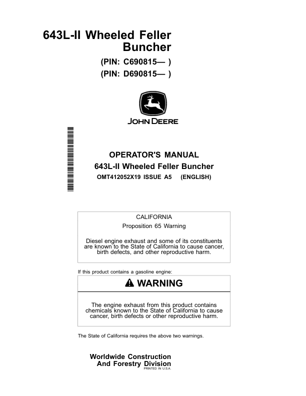 John Deere 643L-II Wheeled Feller Bunchers Operator’s Manuals (OMT412052X19)