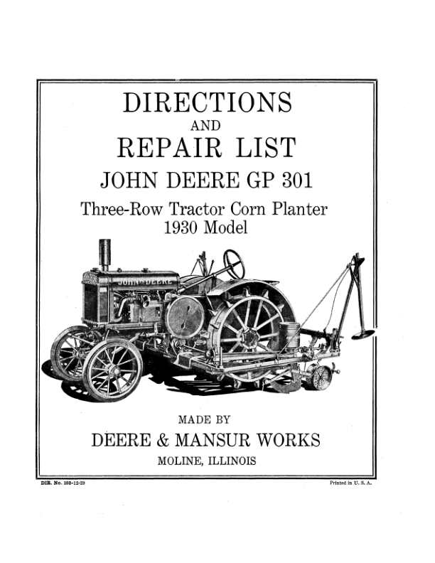 John Deere GP301 Three-Row Tractor Corn Planter Operator’s Manual (DIR103B)