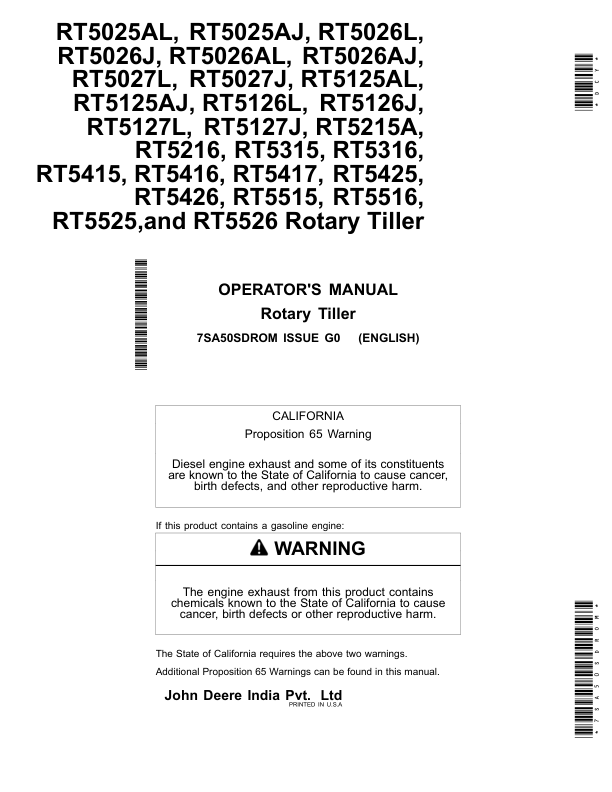 John Deere RT5025AL, RT5025AJ, RT5026L, RT5026J, RT5026AL, RT5026AJ, RT5027L, RT5027J, RT5125AL, RT5125AJ, RT5126L, RT5126J, RT5127L, RT5127J, RT5215A, RT5216, RT5315, RT5316, RT5415, RT5416, RT5417, RT5425, RT5426, RT5515, RT5516, RT5525, RT5526 Rotary Tiller Operator’s Manual (7SA50SDROM)